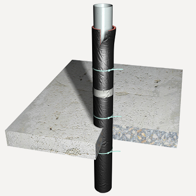 Isolation acoustique au bruit aérien d'une colonne de chute de 90 mm de diamètre, réalisée avec complexe multicouche, de 7 mm d'épaisseur, 3,7 kg/m² de masse surfacique, constitué d'un film en polyéthylène de 5 mm d'épaisseur et une membrane viscoélastique de haute densité de 2 mm d'épaisseur; placé autour de la descente en guise de coque avec brides en plastique. Comprend le ruban viscoélastique autoadhésif, pour le scellement des joints.