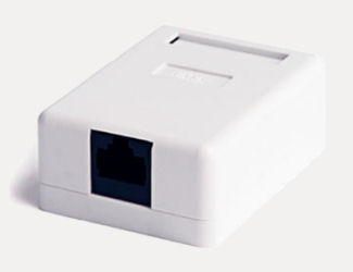 Prise de surface simple constituée de connecteur femelle type RJ-45 de 8 contacts, catégorie 6 et boîte en saillie, de 47x64,5x25,2 mm, couleur blanche.