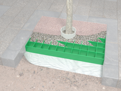 Entourage d'arbre d'infiltration constitué de géotextile en polypropylène, (120 g/m²), grille alvéolaire en polyéthylène haute densité stable aux rayons UV, de 73x73x7 cm, couleur verte et remplissage des cellules avec grave filtrante sans classification, pour trafic piéton, avec une résistance à la flexotraction de 3 N/mm², une résistance à compression de 6 N/mm² et une capacité drainante >=150 l/(m²·min), résistance au glissement supérieur à 45.