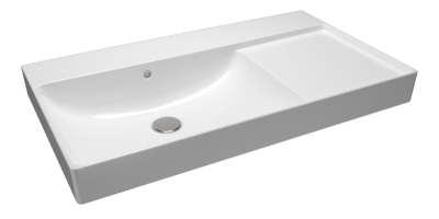 Lave-mains asymétrique mural avec surface d'appui à droite, en argile réfractaire, finition thermo-émaillée, couleur blanche, de 530x310x135 mm, avec un orifice pour la robinetterie à droite, avec vanne d'écoulement en laiton chromé et jeu de fixation à 2 pièces, et évacuation avec siphon bouteille en ABS, finition brillante imitation chrome. Comprend le silicone pour le scellement des joints.