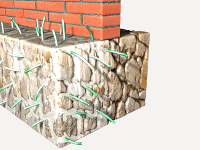 Coulis de ciment à base d'eau et mortier sec de retrait compensé, injecté sous pression à travers les trous existants dans la fondation en maçonnerie à sec, avec des graviers ou des gravats, en augmentant sa capacité portante, en reprise en sous-oeuvre de fondation. | ||