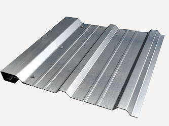Tôle profilée en acier galvanisé prélaqué, de 0,6 mm d'épaisseur, avec nervures entre 40 et 50 mm de hauteur de crête, écartées entre 250 et 270 mm et inertie entre 13 et 21 cm4, selon NF EN 14782.